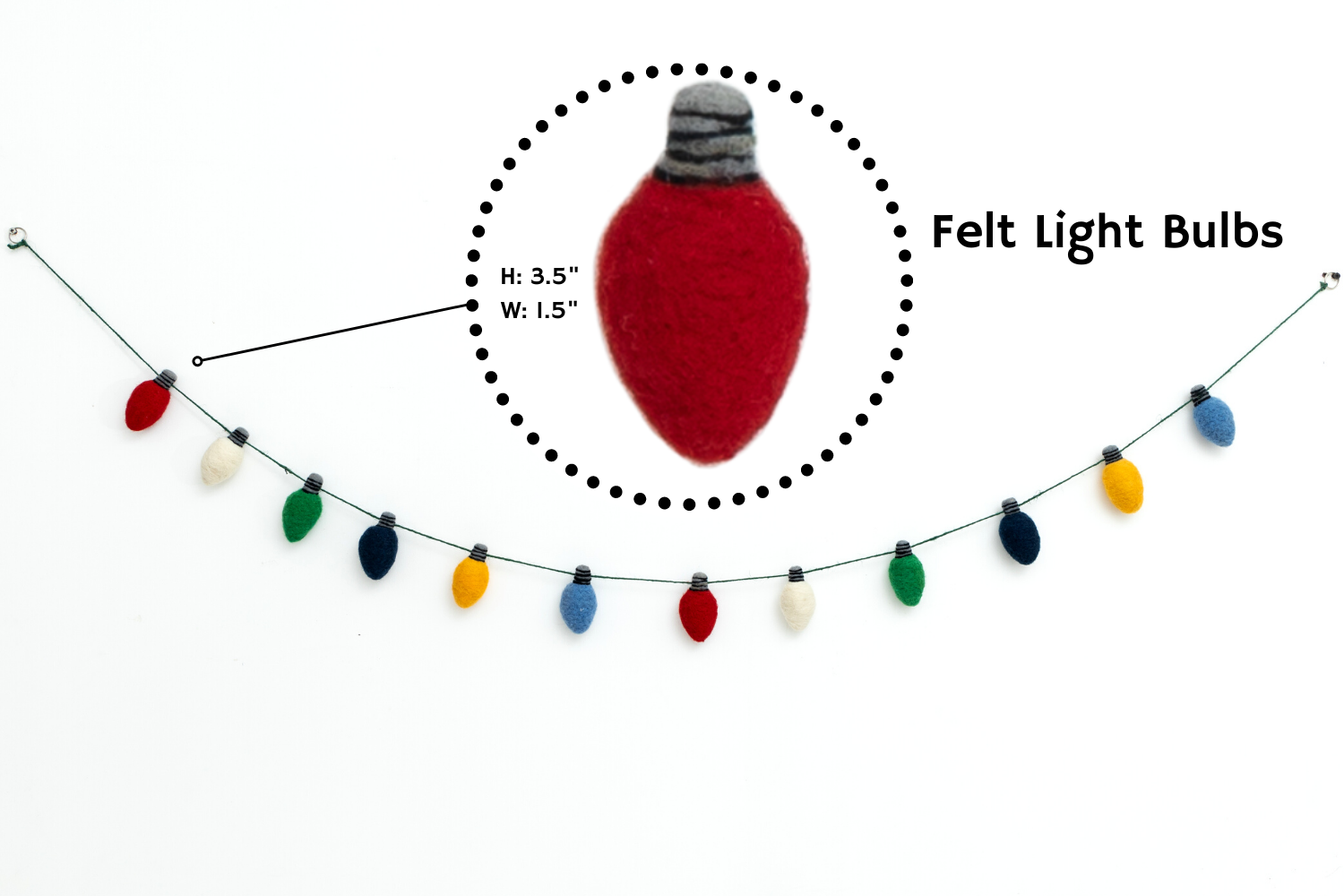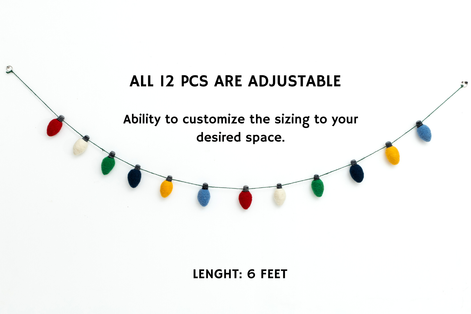 BULBS ARE ADJUSTABLE AND EASY TO MOVE: 100% wool felt handcrafted and hand sewn on sturdy cotton decorative twine. Our garlands are designed to allow spacing between the products. Once the felt elements are spaced out approx. 2″ apart they will fill a total twine length of 6 ft. We design our garlands that give you the ability to customize the sizing to your desired space.